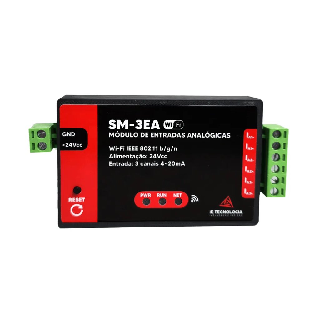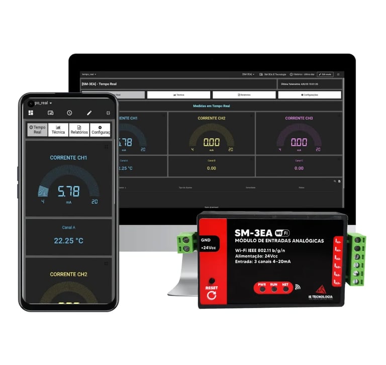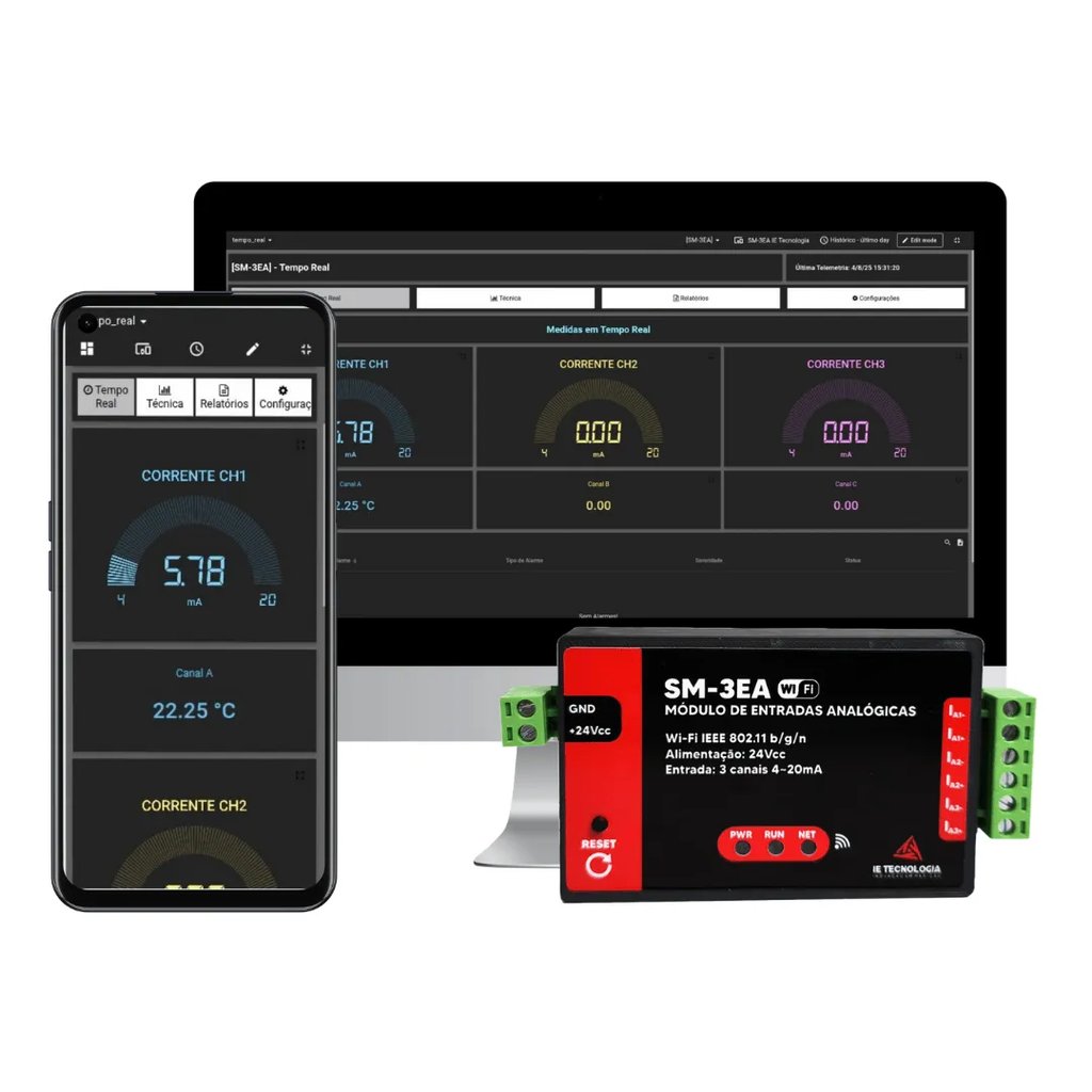 O SM-3EA lê até três sinais analógicos 4-20 mA (pressão, nível, temperatura, etc.), converte para valor de engenharia e disponibiliza via rede.