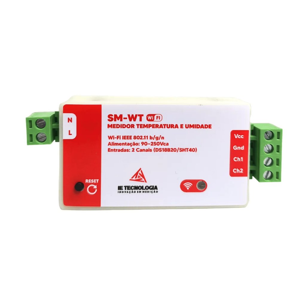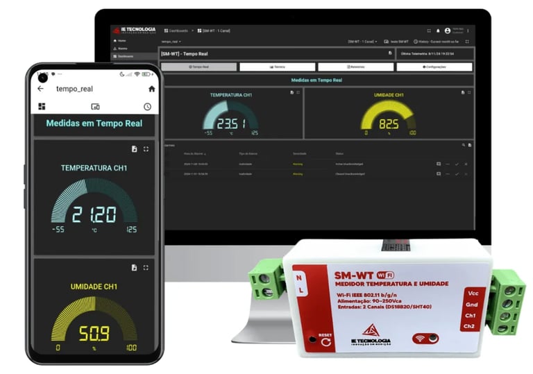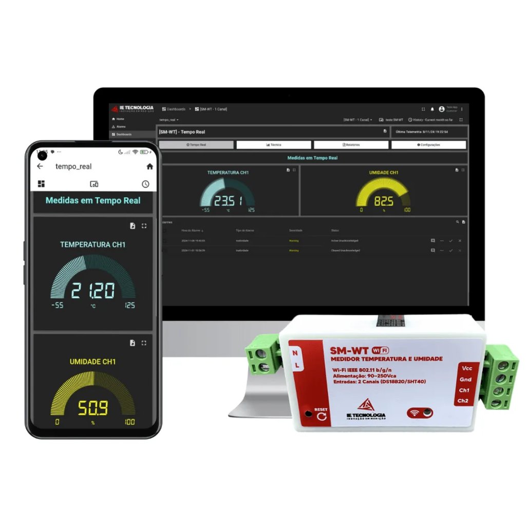 O SM-WT monitora temperatura e umidade em tempo real, usando sensor interno e/ou sondas externas para pontos críticos (câmara fria, sala técnica etc.).
