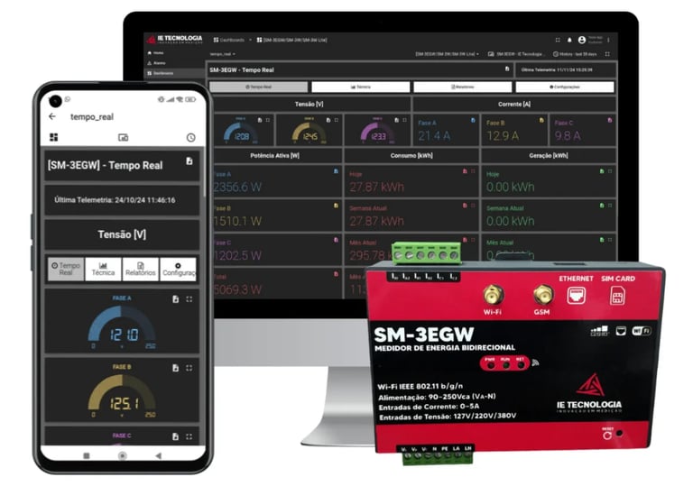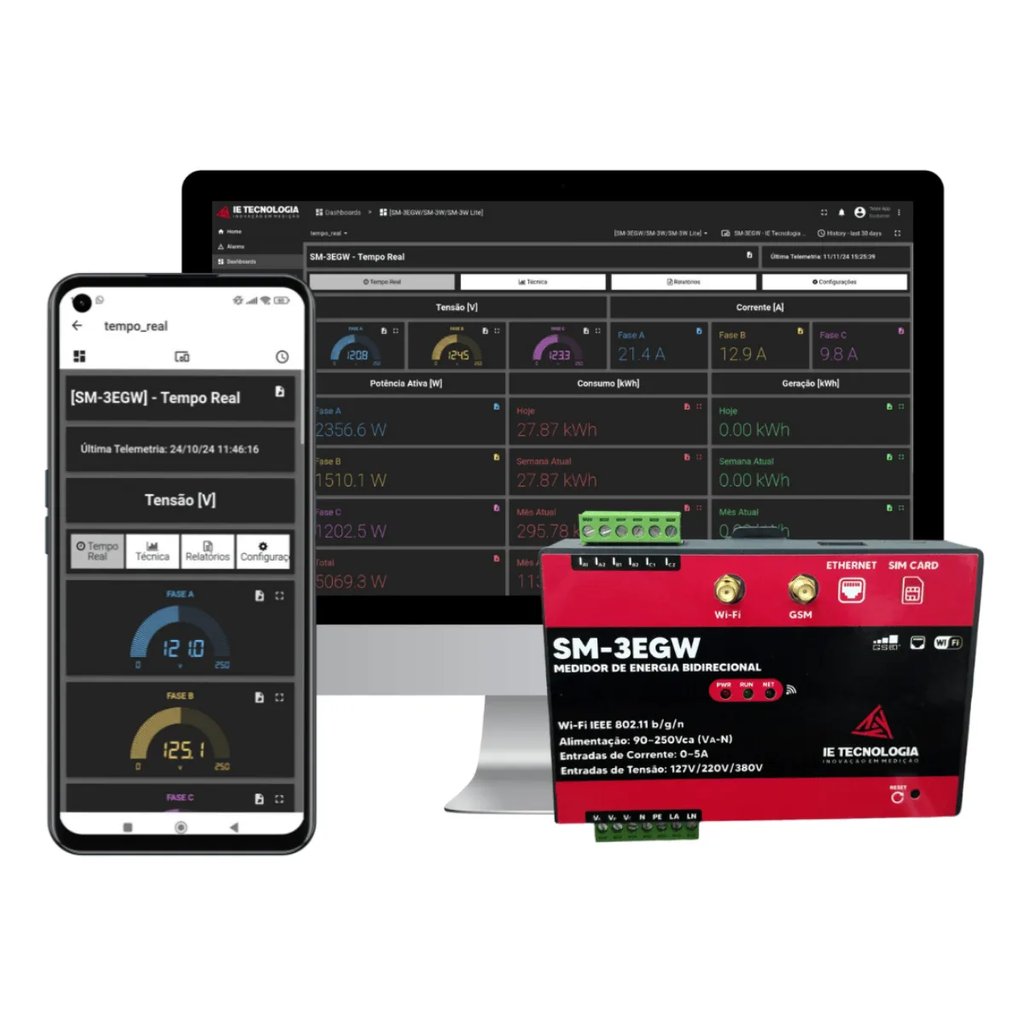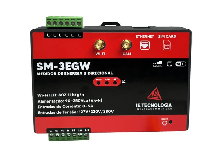 O SM-3EGW faz a mesma medição avançada de energia (consumo e geração, mais de 40 grandezas), mas com comunicação via Wi-Fi, Ethernet e GSM, incluindo envio seguro HTTPS.