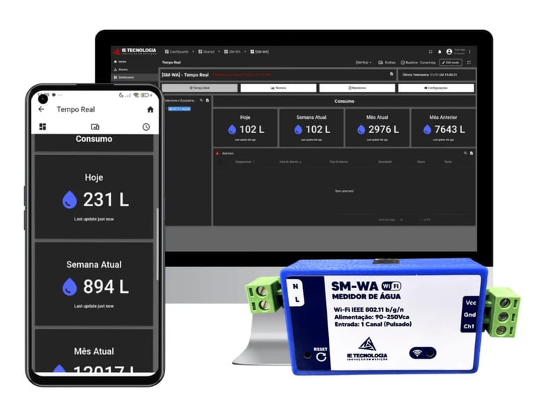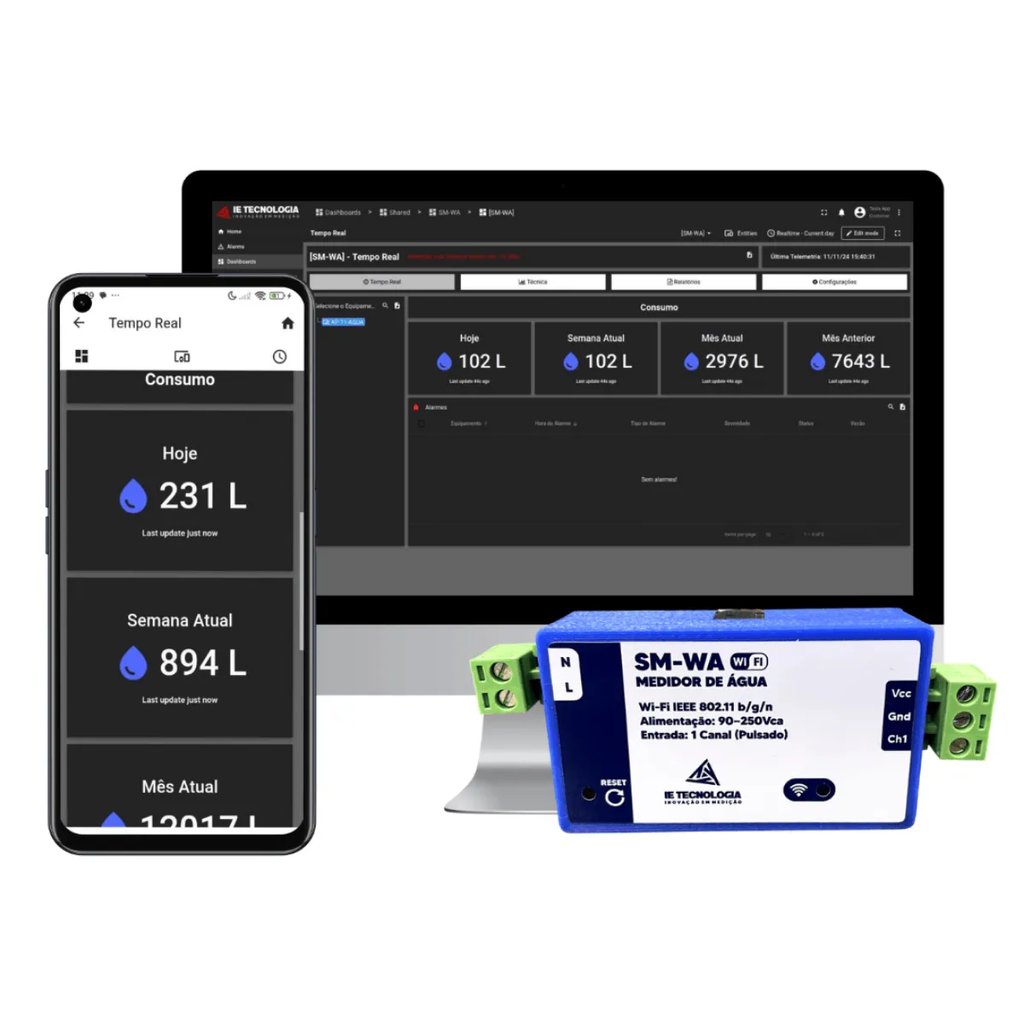 O SM-WA mede o consumo de água em litros a partir de hidrômetros ou sensores de vazão com saída pulsada e armazena o histórico.