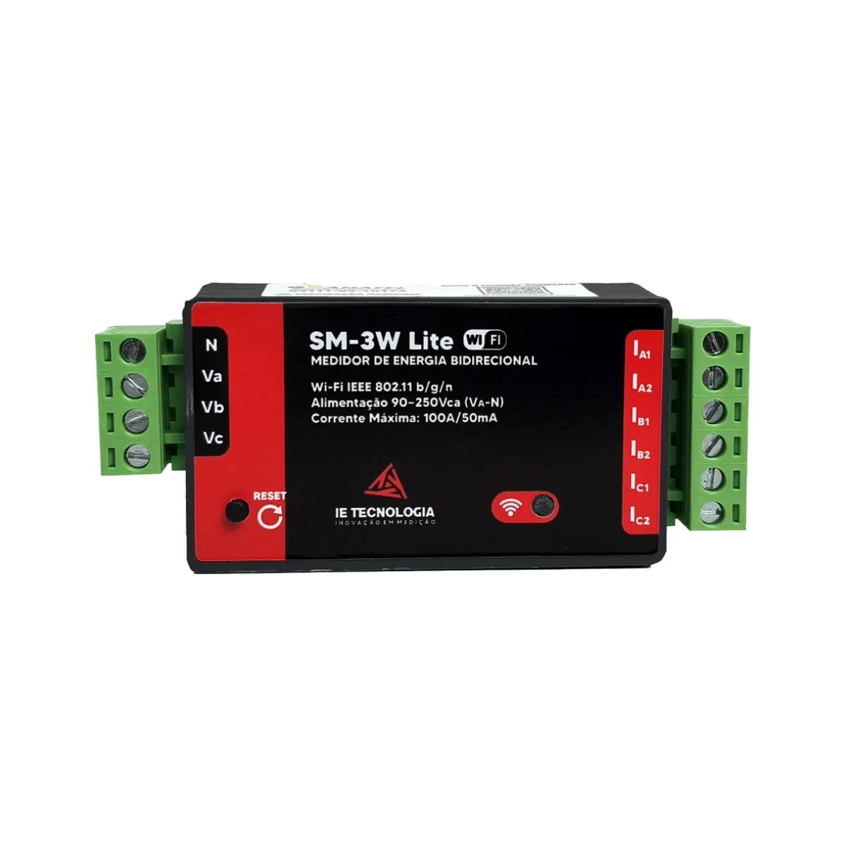 O SM-3W Lite mede consumo e geração de energia em instalações até cerca de 100 A, acompanhando potência ativa, corrente, tensão e energia injetada na rede.