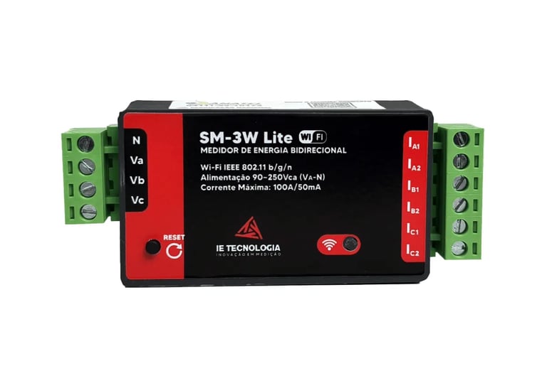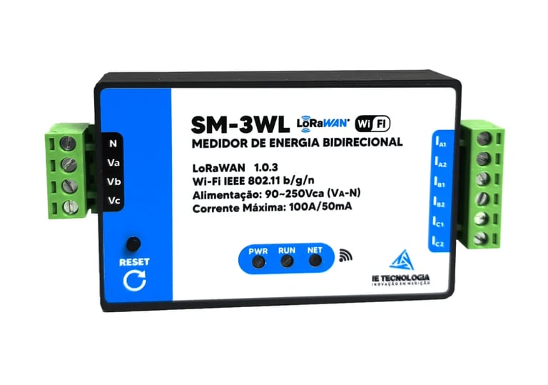 O SM-3WL mede consumo e geração de energia trifásica e transmite os dados via Wi-Fi e LoRaWAN, permitindo comunicação local ou por rádio.